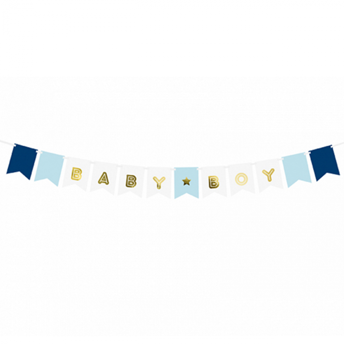 Verzaubern Sie die Babyparty mit diesem süßen Baby Boy Banner. Der Mix aus Hellblau, Weiß und Gold sieht einfach zauberhaft aus!