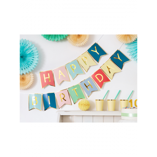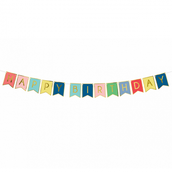 Der bunte Banner mit goldenen Buchstaben ist ideal geeignet für die Partydekoration. Verschönern Sie den Raum und überraschen das Geburtstagskind!